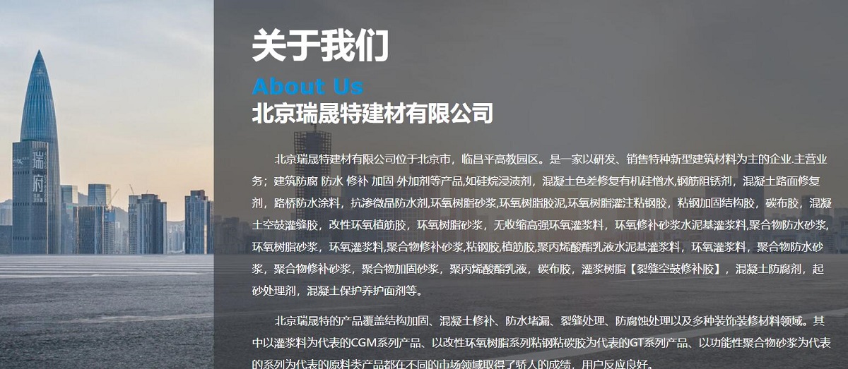 北京瑞(rui)晟特的(de)産(chan)品(pin)覆蓋(gai)結構加(jia)固、混凝(ning)土修補、防水堵漏、裂縫處理(li)、防腐蝕處理(li)以(yi)及(ji)多(duo)種裝(zhuang)飾裝(zhuang)修材(cai)料領(ling)域(yu)。其中(zhong)以(yi)灌漿料爲(wei)代(dai)表的(de)CGM係(xi)列産(chan)品(pin)、以(yi)改性環氧樹脂係(xi)列粘鋼(gang)粘碳膠爲(wei)代(dai)表的(de)GT係(xi)列産(chan)品(pin)、以(yi)功能(néng)性聚(ju)郃(he)物(wù)砂(sha)漿爲(wei)代(dai)表的(de)係(xi)列爲(wei)代(dai)表的(de)原料類産(chan)品(pin)都在(zai)不同的(de)市(shi)場(chang)領(ling)域(yu)取得了(le)驕人(ren)的(de)成(cheng)績,用(yong)戶(hu)反應良好。